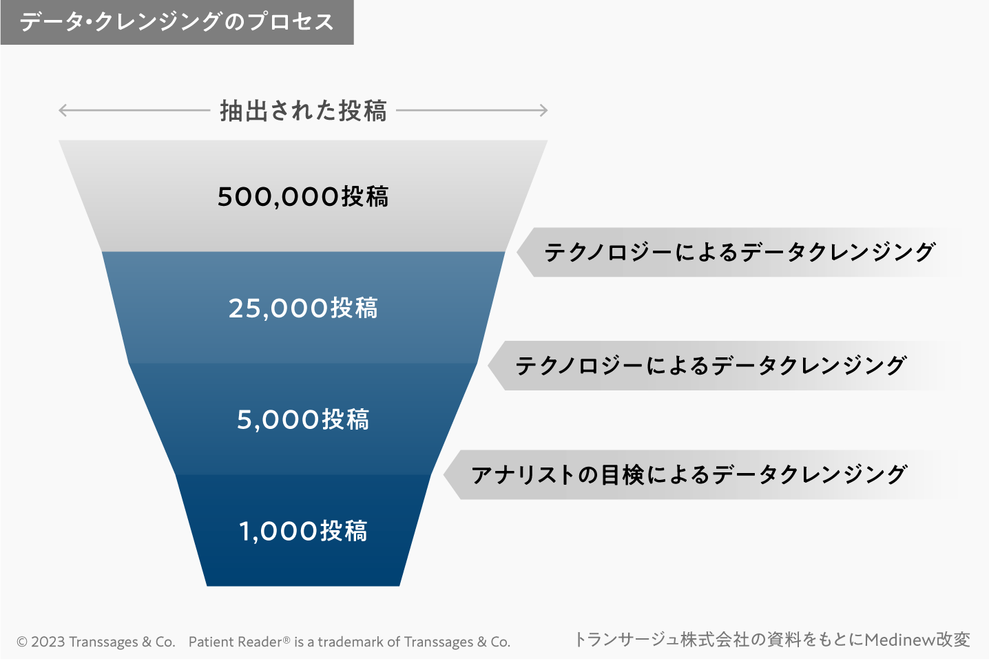 こうしたプロセスを「クレンジング」と言います(下図)。特にヘルスケアのソーシャル・リスニングでは消費財などの場合にはそれほど気にされない噂話的な内容も丁寧に除外しなければなりません。そのため、この領域のリスニングのハードルの一つとして、このクレンジングを挙げることができます。