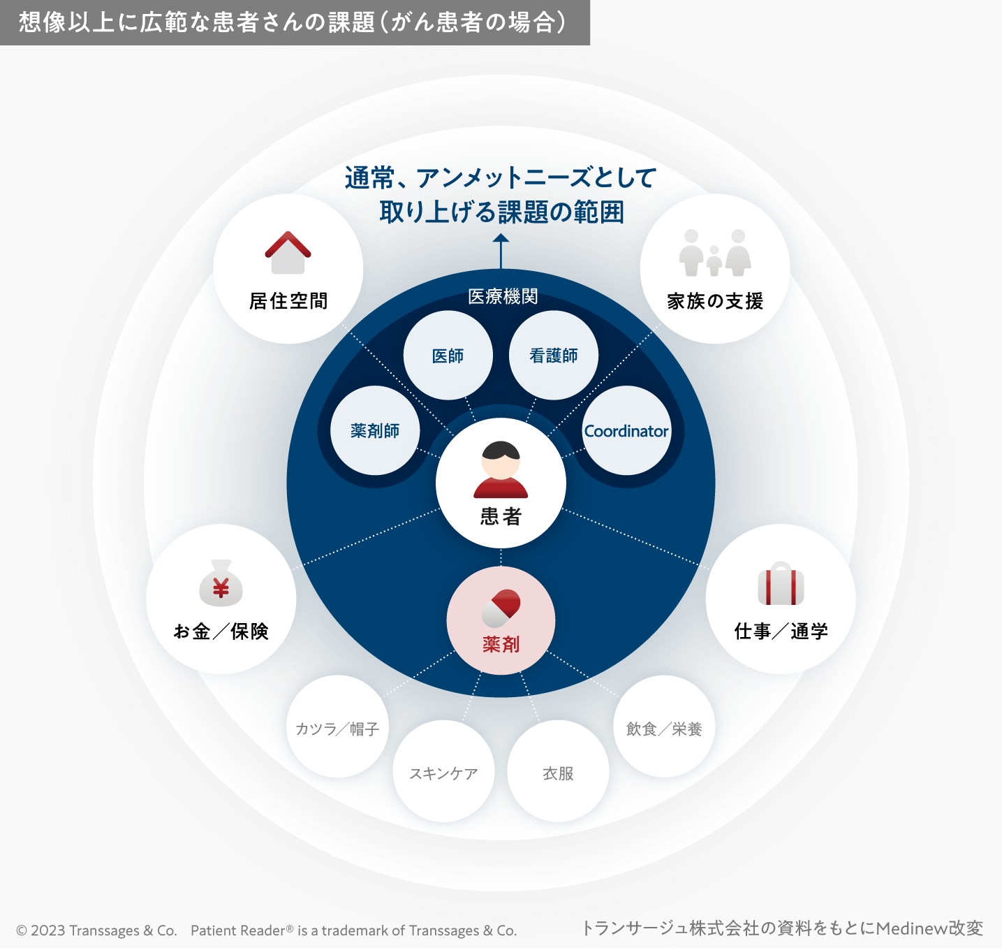 ところが、実際に質問設計なしに患者さんの声を拾い集めてみると、診察治療や費用負担といった比較的医療に直接的に関わる範囲を遥かに飛び越えて、住まいや交通手段、仕事や学校など、とても広い範囲で課題やアンメットニーズが存在していることに気付かされます(下図)。